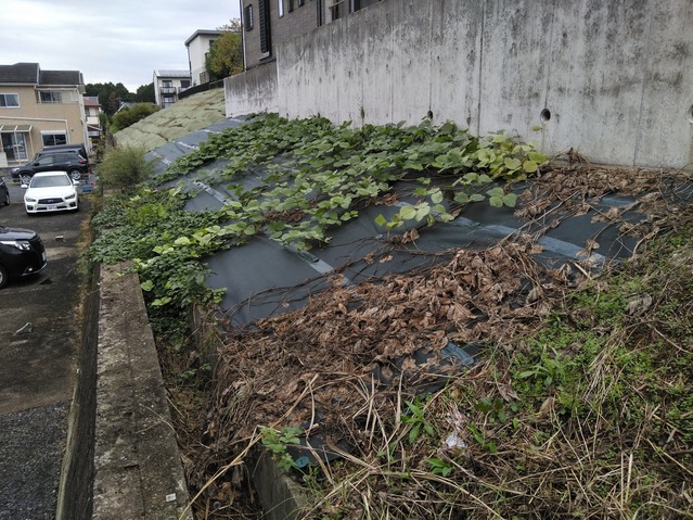 お客様の敷地の斜面に施工された防草シートの隙間から雑草が生えてきて側溝内まで繁茂しており、側溝の排水まで影響しそうな状態でした。