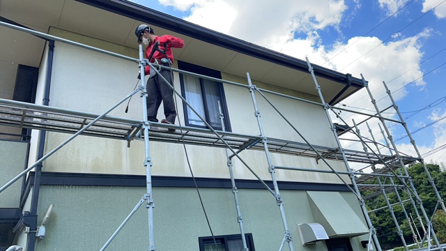 足場を作成し、安全面に留意しながら外壁をお掃除していきます。